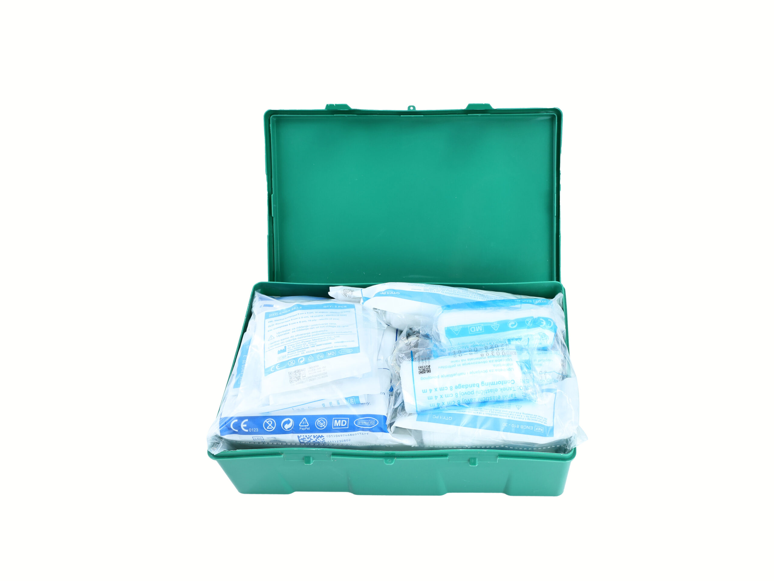 Esta caixa PP premium 27x9x26cm está equipada com 25 itens essenciais (ligaduras, pensos, tesouras, cobertor de emergência e mais) para cada necessidade de segurança. Ideal para atacadistas — preços escaláveis (US$ 18,5/1000, US$ 17,2/5000 unidades FOB Ningbo). Durável, compatível e pronto para o mercado. Aumente o seu inventário com esta solução que salva vidas!