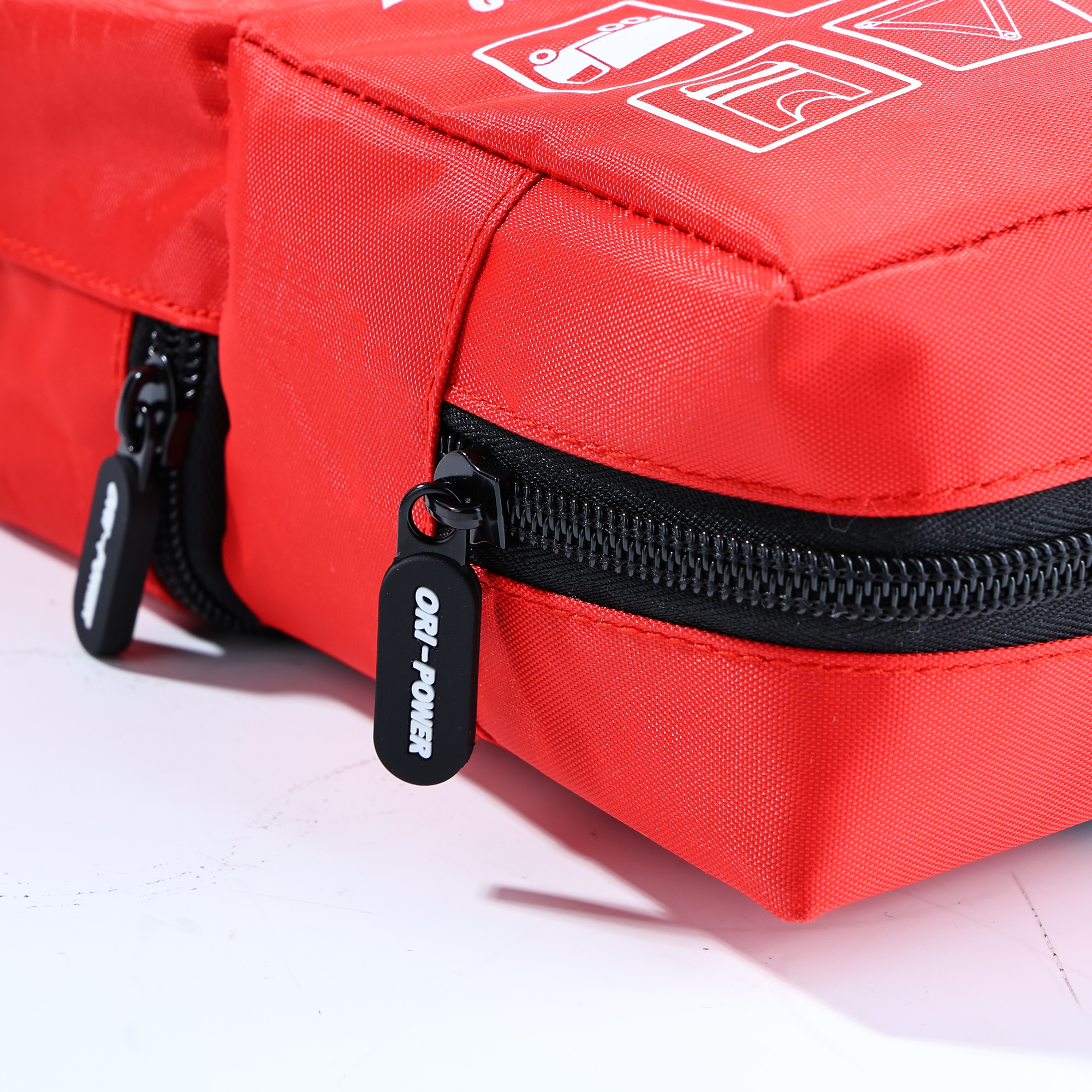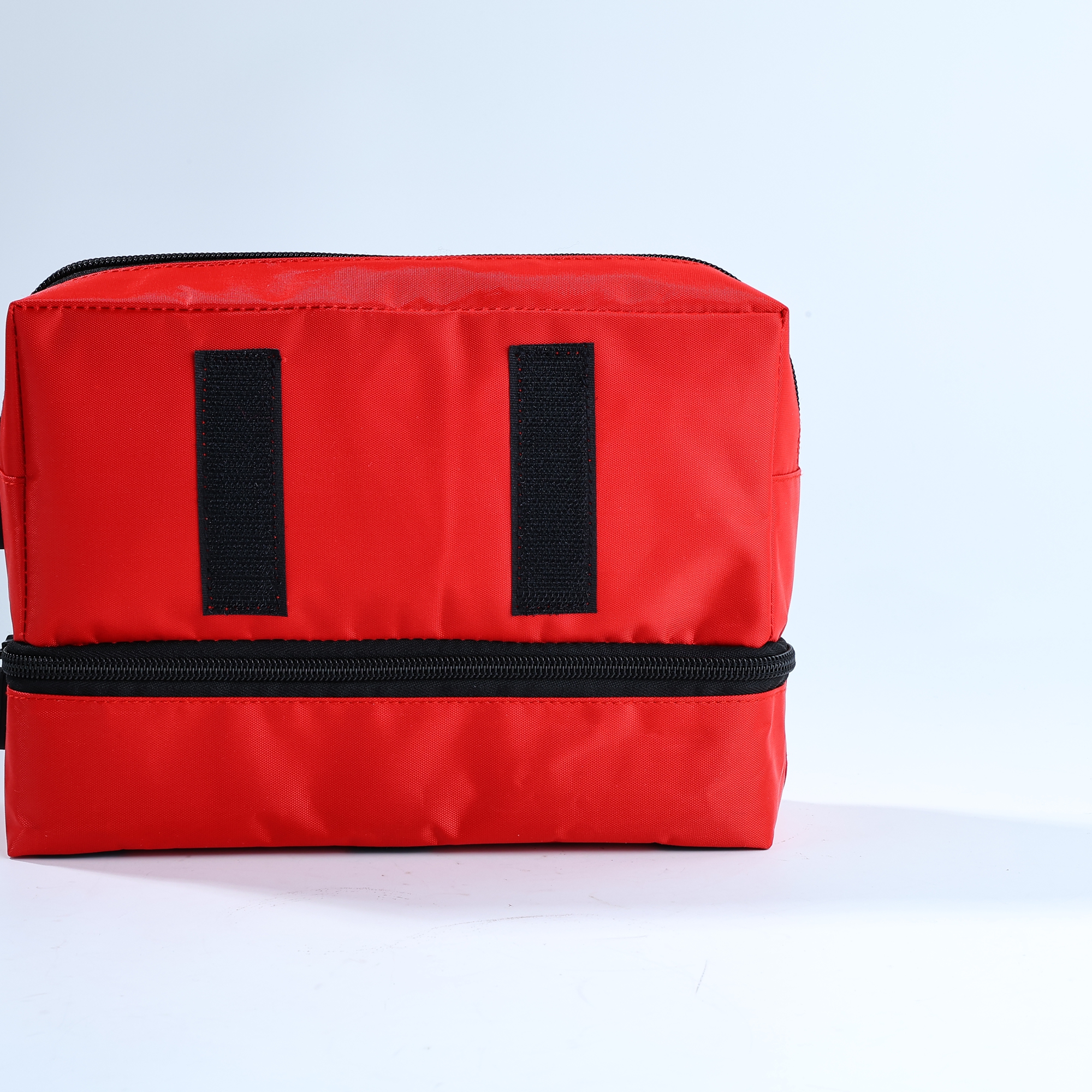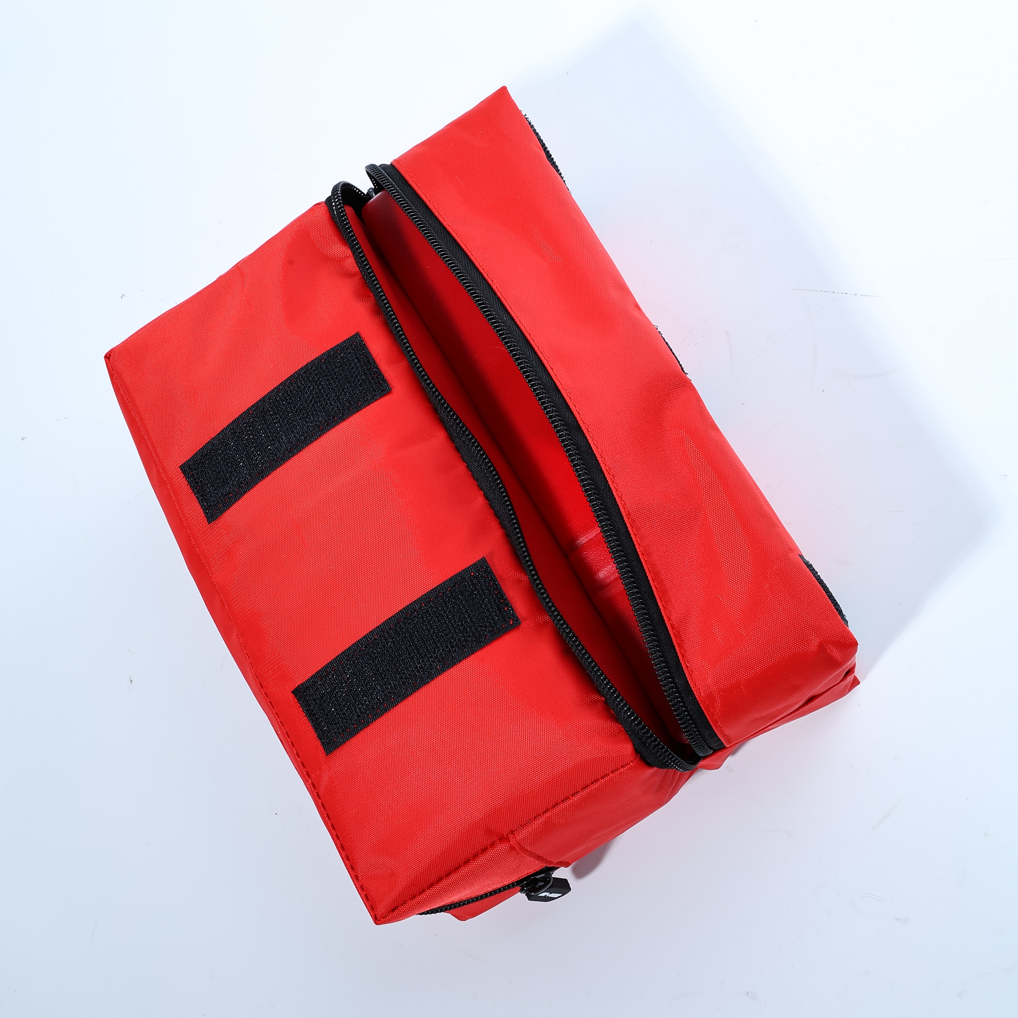 Cada item é organizado em um saco trapezoidal vermelho durável, facilitando o acesso sob pressão.